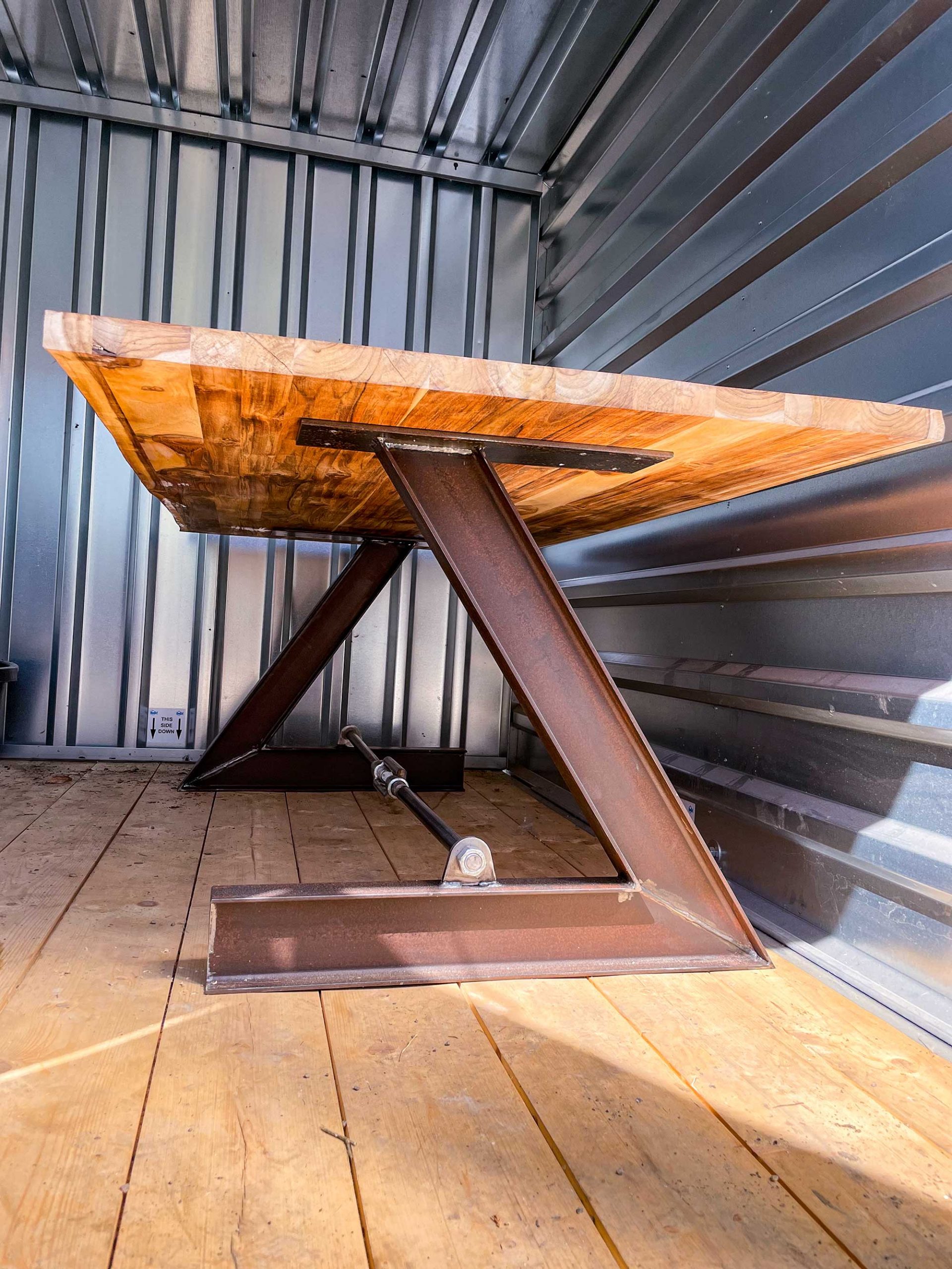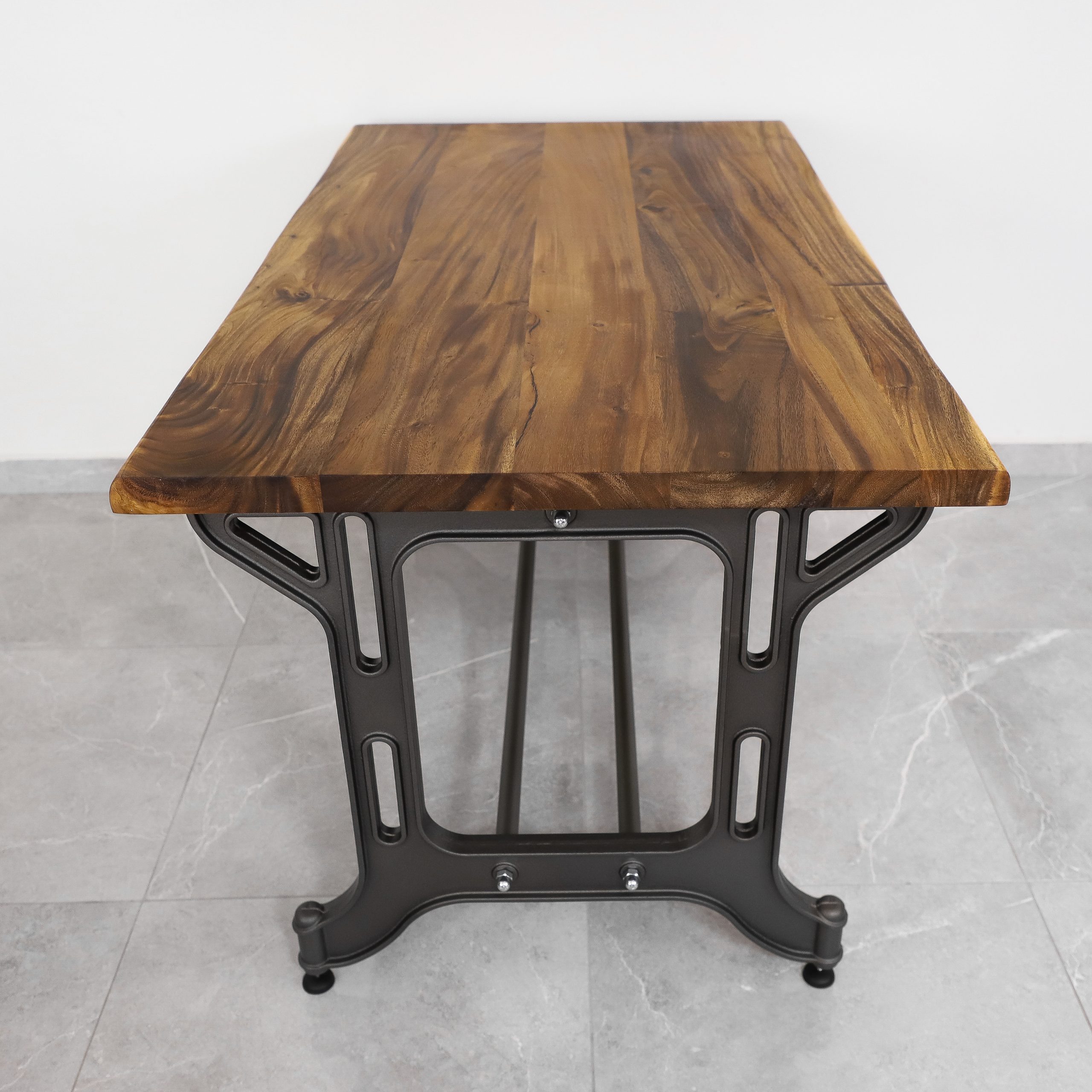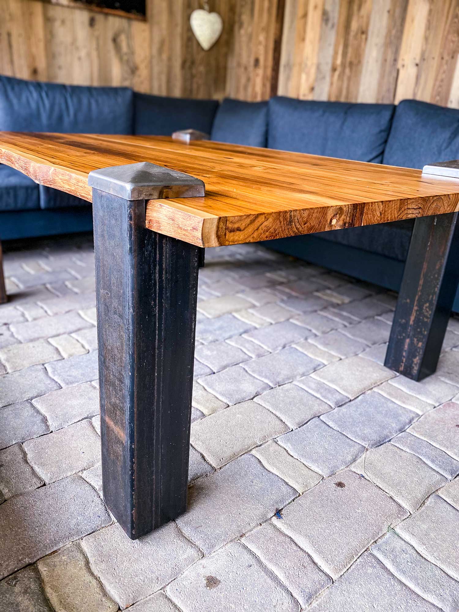 Eine massive Echtholzplatte mit ihrer einzigartigen intensiven Maserung und Struktur kombiniert mit echtem Stahl.